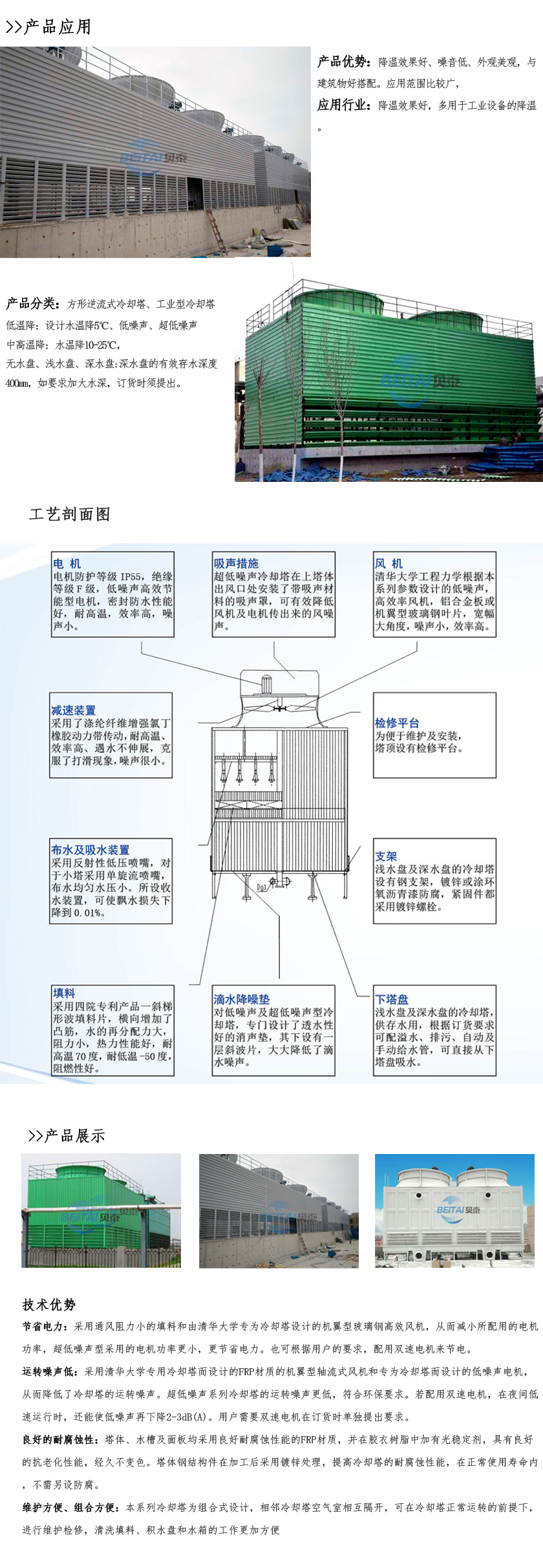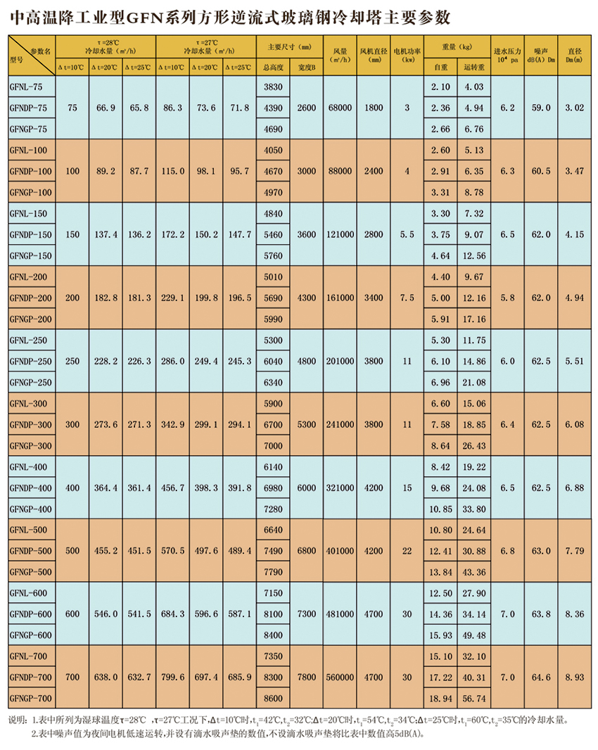 工業(yè)型玻璃鋼冷卻塔,室友機(jī)械工業(yè)部第四設(shè)計(jì)研究院在原設(shè)計(jì)的同類塔測(cè)試數(shù)據(jù)基礎(chǔ)上改進(jìn)設(shè)計(jì)的。本設(shè)計(jì)的特點(diǎn)是冷卻塔風(fēng)機(jī)配有變扭矩雙速電機(jī);當(dāng)氣溫較低時(shí),例如晚上,電機(jī)開(kāi)低速,冷卻噪聲可低3-5dB(A)。此外,選用雙速電機(jī)節(jié)電顯著。多臺(tái)冷卻塔配單速電機(jī)時(shí),為了節(jié)電,當(dāng)空氣濕球溫度低時(shí),可停部分電機(jī),但仍比用雙速電機(jī)(以年計(jì))多耗電40%。